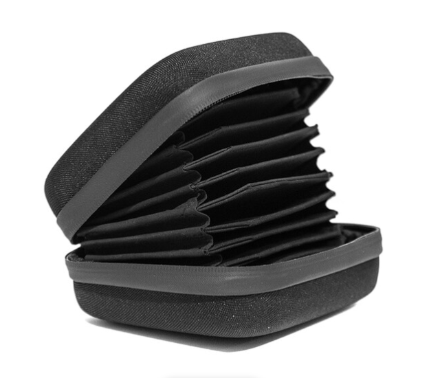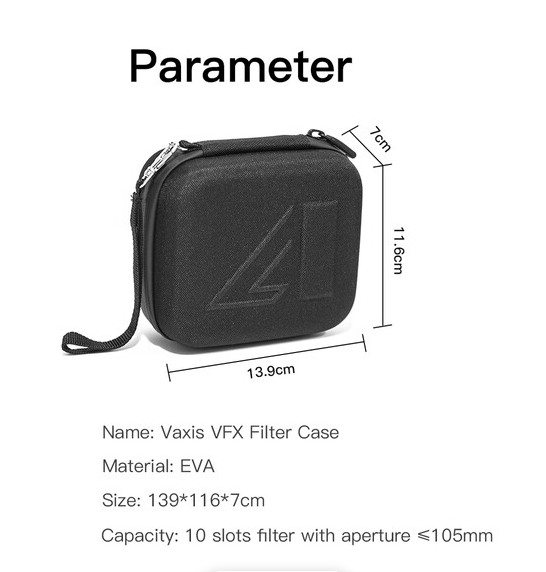Vaxis VFX kutija za filtere (VAR23-13) je kompaktno, vodootporno i izdržljivo crno rješenje za pohranu koje sigurno drži do deset filtera od 105 mm u pojedinačnim utorima obloženim tkaninom kako bi se spriječile ogrebotine, s pouzdanim zatvaračem na patentni zatvarač i robusnom tkaninom za siguran transport i organizaciju filmskih filtera na setu.