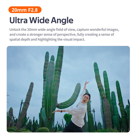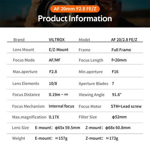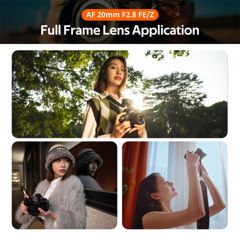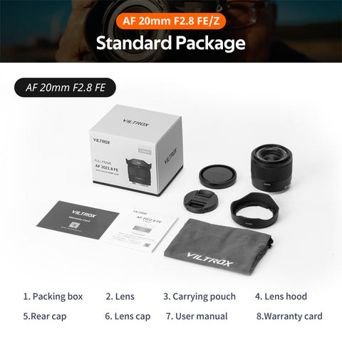 Viltrox AF 20 / 2.8 FE je objektiv s automatskim fokusom dizajniran za modele fotoaparata Sony E-mount/Nikon Z-mount. S 10 elemenata u 8 skupina, ima izvanredne optičke performanse. Minimalna udaljenost fokusa od oko 0,19 m daje lijepe snimke izbliza. A tihi STM motor za fokusiranje može točno kontrolirati pokretni položaj i omogućiti precizno i glatko fokusiranje. Odličan izbor za snimanje portreta, pejzaža, krupnih planova i video blogova!