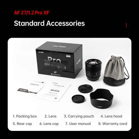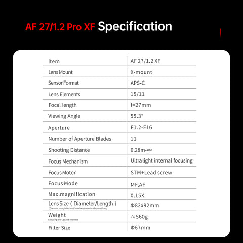 Objektiv AF 27 mm F1.2 Pro drugi je objektiv s fiksnim otvorom blende ultra-velikog otvora blende u vrhunskoj seriji Pro koju je lansirao Viltrox nakon AF 75 mm F1.2 Pro. Nastavljajući nevjerojatnu ultravisoku razlučivost serije Pro i super veliki otvor blende F1.2 za iznimno ugodan bokeh.