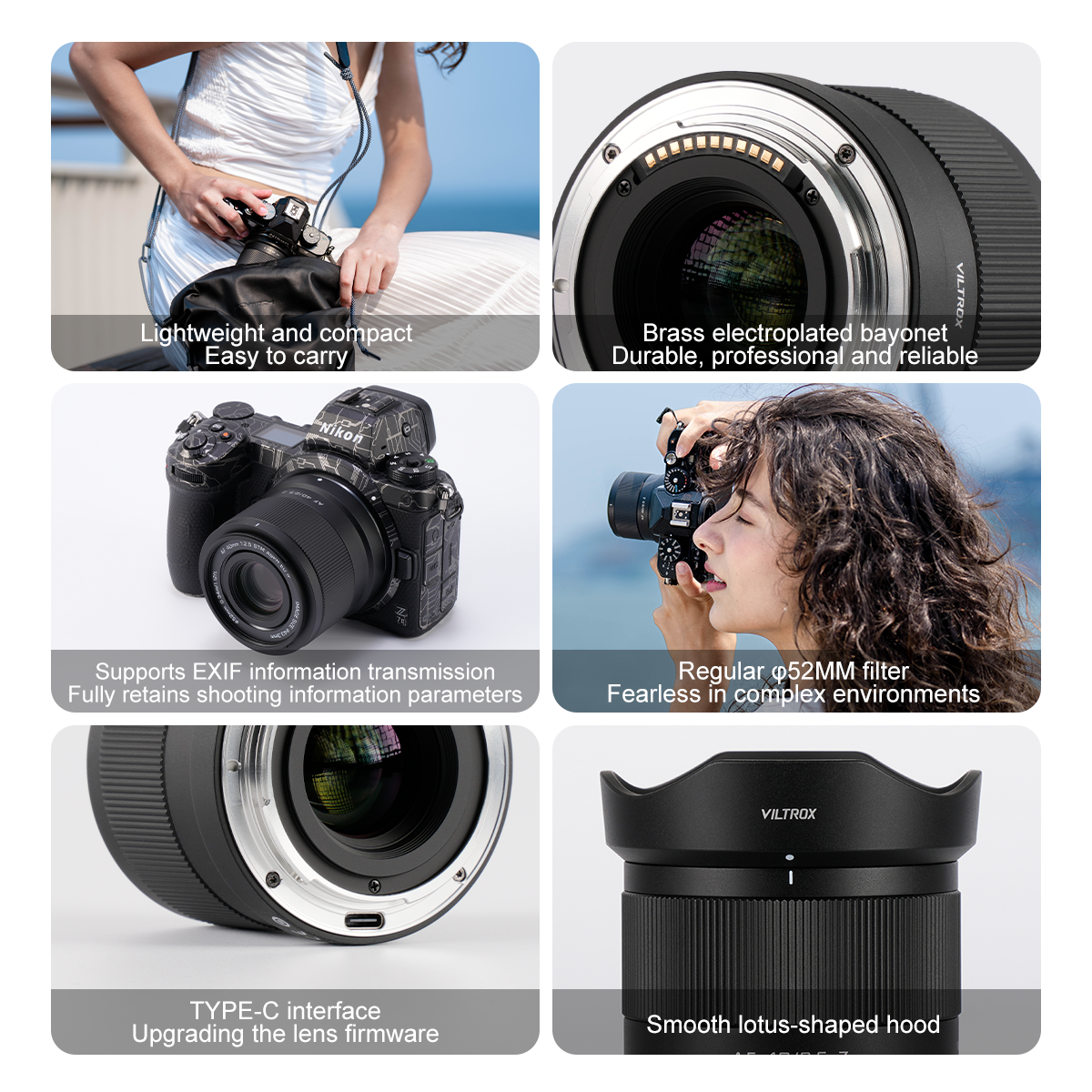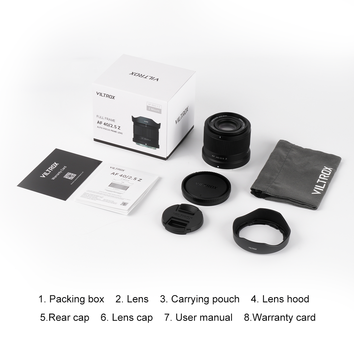 AF 40mm F2.5, Viltrox Air serija laganih full-frame serija predstavlja žarišnu duljinu od 40 mm, učinkovit i precizan sustav autofokusa za snimanje prekrasnih trenutaka, tako da svatko može uživati u zabavi fotografije. Pokriva polje slike punog kadra i odgovara više modela. Kompaktno i lagano tijelo objektiva, jednostavno za nošenje. Svestrana žarišna duljina od 40 mm idealna je za svakodnevno snimanje i putovanja.