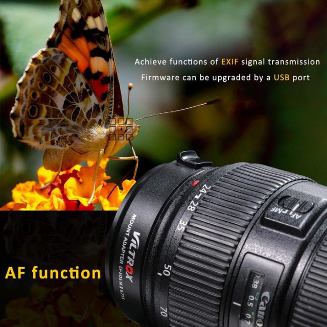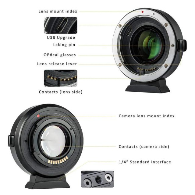 Uz mehaničku prilagodbu Canon EF objektiva za EF-M bajonet (M sustav), također smanjuje žarišnu duljinu (x 0,71) i povećava otvor blende za cca 1 f-stop. El. kontakti prenose naredbe za autofokus i otvor blende, kao i EXIF metapodatke; USB priključak se koristi za nadogradnju FW-a. Donja strana adaptera ima 1/4" navoj za montažu elemenata/stativa.