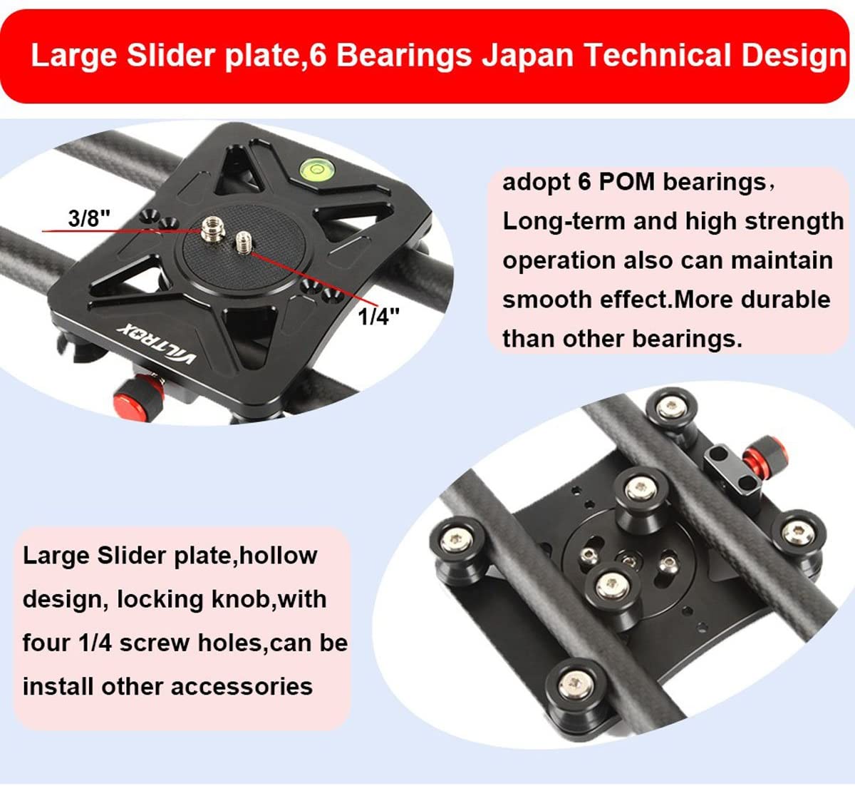 Klizač kamere Viltrox VC-80 od 80 cm izrađen je od ugljičnog kompozitnog materijala i, unatoč maloj težini, podržava postavke kamere težine do 10 kg! Ploča kamere opremljena je vijkom od 3/8"-16, klizač također nudi podesive noge i navoje od 1/4"-20 i 3/8"-16 na dnu i 1/4"-20 na vrhu nosači za širok raspon mogućnosti montaže. Podrazumijeva se i transportna torba.