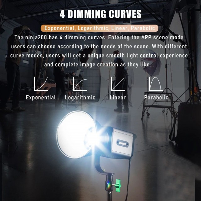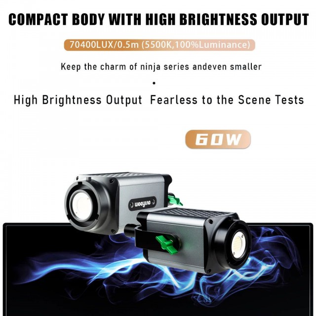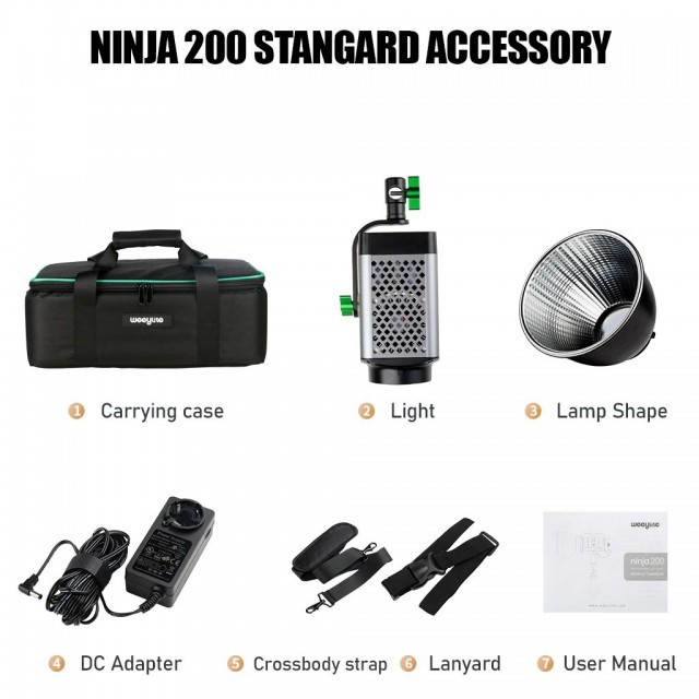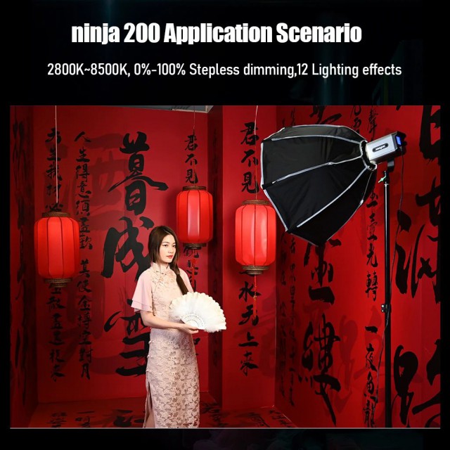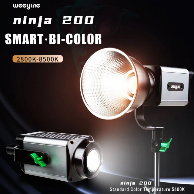 Studio 60W dvobojni LED reflektor Weeylite Ninja 200 koristi modernu COB LED tehnologiju za visoku svjetlosnu snagu i dobar prikaz boja (≥95 RA). Idealan za studijsku fotografiju, video, itd. Nudi potpuno podesivu temperaturu boje u rasponu od 2800K-8500K i intenzitet u rasponu od 0-100% (maks. 5800 lm, 70400 lx/0,5 m). Daljinsko upravljanje ovim modelom moguće je putem Bluetooth sučelja i mobilne aplikacije, napajanje je omogućeno baterijama NP-960/970 (nisu uključene u pakiranje) ili eksternim napajanjem (izvor je uključen u paketu). Dimenzije 175x92x85 mm, težina 990 g. Manje snažna, ali lakše prenosiva varijanta popularnog modela Ninja 400.
