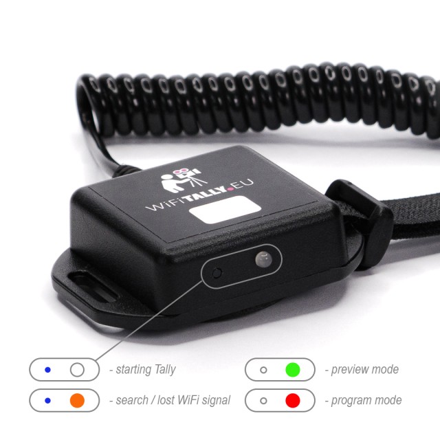 WiFi Tally light micro sadrži dva LED svjetla. Ima plavu boju koja označava status veze ili gubitak signala. Druga LED obavještava snimatelja (snimatelja) o statusu njegovog kadra iznad glave. Ako glavna LED dioda svijetli zeleno, snimak se priprema za emitiranje, a ako svijetli crveno, njegov snimak će biti emitiran. Ovo je usklađeno bojom s uobičajenim dizajnom svih redateljskih videa pregled/zeleno i program/crveno.