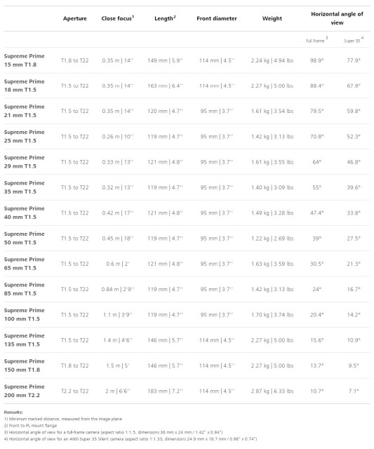 ZEISS Supreme Prime linija vrhunskih filmskih leća nudi maksimalnu dosljednost na svim modelima: dosljednu pokrivenost senzora, boju, svjetlinu (T1,5 na većini modela), veličinu, težinu i raspored kontrola. Sve leće u seriji pouzdano pokrivaju FF senzore (46,2 mm kružnog promjera), podržavaju tehnologiju eXtended Data i - zahvaljujući tehnologiji "Interchangeable Mount System" - kompatibilne su s PL, LPL i EF nastavcima (objektivi dolaze s PL nastavkom kao standardom i metričke oznake).