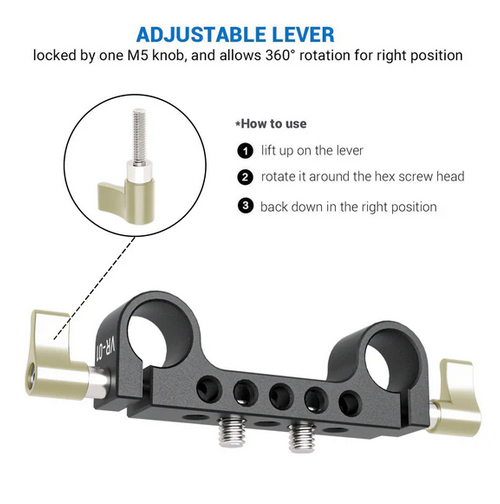 ZGCINE 15 mm Railblock je izdržljiva stezaljka s dvostrukom šipkom dizajnirana za sustave nosača tračnica od 15 mm. Ima višestruke rupe s navojem od 1/4''-20 za pričvršćivanje pribora i wingmaticu s opružnom čegrtaljkom za jednostavno podešavanje u skučenim prostorima.