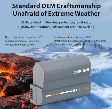 ZGCINE BT-EL15C je potpuno dekodirana zamjenska baterija velikog kapaciteta od 2400 mAh (7,2 V) za Nikon fotoaparate koja se savršeno podudara s originalnom EN-EL15c veličinom i funkcionalnošću - bez upozorenja, puna komunikacija s fotoaparatom - a istovremeno nudi ultra brzo punjenje (potpuno punjenje za otprilike 2 sata s ZGCINE PS/PC punjačima) i naprednu 8-slojnu sigurnosnu zaštitu za pouzdano, produljeno snimanje.