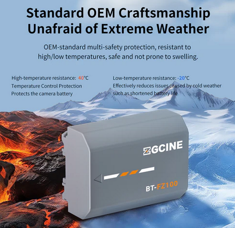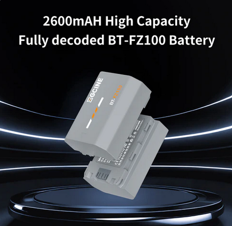 BT-FZ100 je potpuno dekodirana, visokokapacitetna zamjenska baterija treće strane od 2600 mAh (7,2 V) za Sony kamere koja radi identično originalnoj NP-FZ100 – bez iskačućih prozora, s potpunom komunikacijom s kamerom i potpuno istom fizičkom veličinom – uz podršku za brzo punjenje (potpuno punjenje za ~2,5 sata s ZGCINE PS/PC punjačima) i vrhunsku 8-slojnu sigurnosnu zaštitu.