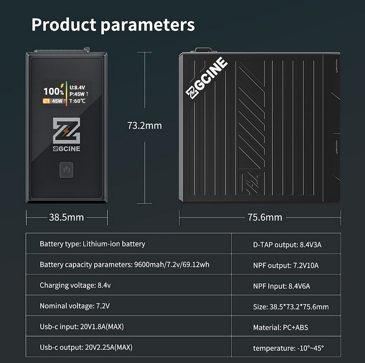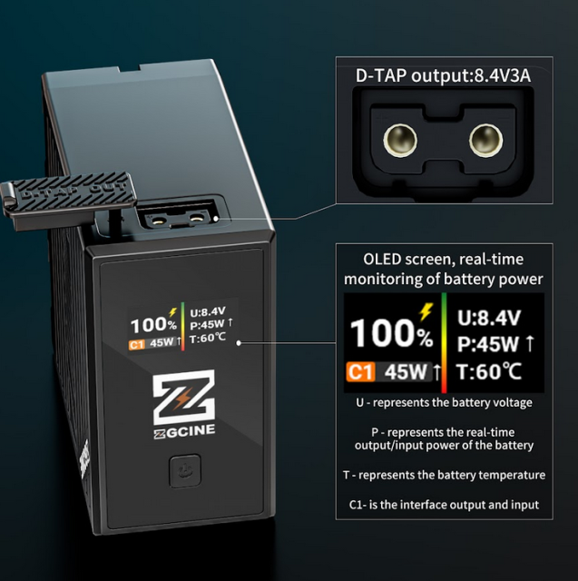 ZGCINE BT-NPF970 je kompaktna litij-ionska baterija L-serije od 9600 mAh (69,12 Wh) s PD brzim punjenjem do 36 W, D-TAP (8,4 V/3 A) i NPF izlazima, OLED praćenjem napona, snage i temperature u stvarnom vremenu te sveobuhvatnom sigurnosnom zaštitom - idealna za napajanje profesionalnih video platformi, monitora i svjetala.