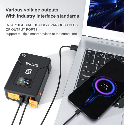 Podržava USB-C ulaz s brzinom punjenja od 20 V/2 A (MAX) i nudi više mogućnosti izlaza, uključujući USB-C , D-Tap i DC . USB-C izlaz pruža svestrane mogućnosti napajanja od 5 V do 20 V , dok D-Tap izlaz može isporučiti do 14,8 V/9,6 A , što ovu bateriju čini prikladnom za širok raspon uređaja, od kamera do LED svjetala velike snage .