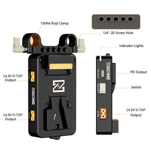 ZGCINE VM-VP3 je kompaktna V-mount ploča dizajnirana za napajanje vašeg fotoaparata i dodatne opreme iz jedne V-mount baterije. Ima više reguliranih izlaznih priključaka, uključujući USB-C PD i tri D-Tap priključka, zajedno s BPU priključkom za kompatibilne fotoaparate. S jednostavnim upravljanjem napajanjem jednim gumbom, ova ploča je svestrano i pouzdano središte za napajanje.
