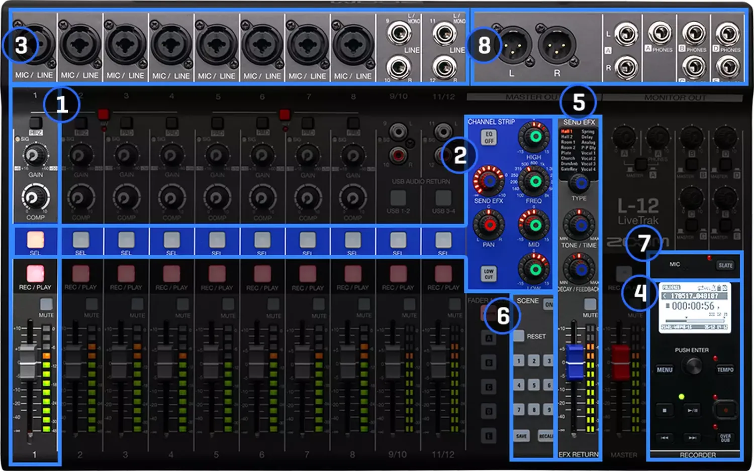 LiveTrak L-12 jedina je digitalna konzola koja vam omogućuje miksanje zvuka uživo, istovremeno snimanje do dvanaest pjesama, au međuvremenu čak i stvaranje pet neovisnih mikseva za slušalice koji se mogu slobodno konfigurirati. Konačno, možete miksati, snimati i pratiti na jednom uređaju.