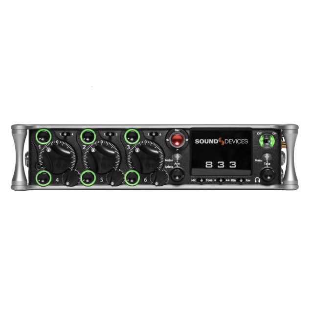 Model 833 ima 6 mikrofonskih/linijskih pretpojačala, 8 kanala, 12 staza, 6 analognih izlaza i vrlo precizan generator vremenskog koda. Također nudi brojne značajke prenesene iz vrhunskog modela Sound Devices Scorpio uključujući. novi sklopovi pretpojačala, 2 utora za SD kartice, dva utora za L-Mount akumulatore i interni SSD disk od 256 GB. Osim toga, također koristi istu FPGA arhitekturu za obradu podataka kao Scorpio uklj. fleksibilno usmjeravanje signala: fizički ulazi mogu se dodijeliti bilo kojoj stazi.
